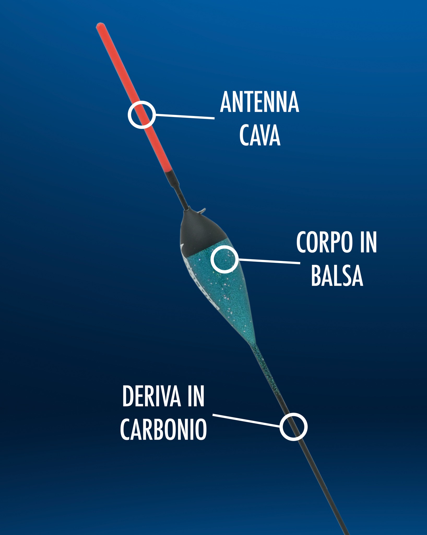 Balsa float with a carbon stem and hollow plastic antenna (interchangeable) mounted on a fibreglass pin.